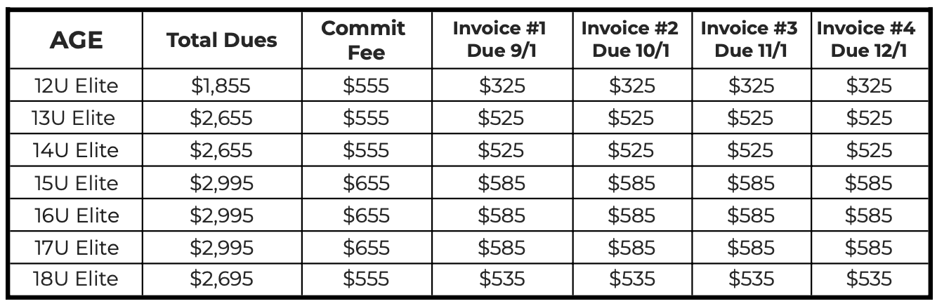 2025 - 2026 ELITE DUES SCHEDULE